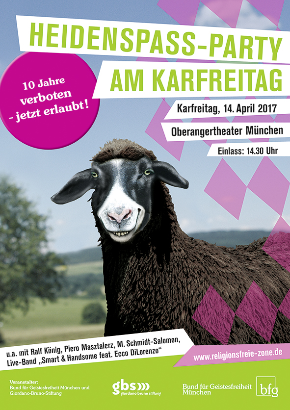 Jahre verboten - jetzt erlaubt: Vor wenigen Monaten erklärte das Bundesverfassungsgericht das Verbot der "Münchener Heidenspaß-Party 2007" und die entsprechenden Bestimmungen des Bayerischen Feiertagsgesetzes für nichtig. In seinem Urteil stellte das Gericht fest, dass am "stillen" Karfreitag sehr wohl getanzt werden darf – sofern der Tanz Ausdruck einer klaren weltanschaulichen Abgrenzung gegenüber dem Christentum ist. Dies lassen sich die Veranstalter des "Heidenspaßes", der bfg München und die Giordano-Bruno-Stiftung, nicht zweimal sagen und laden nach 10-jähriger Abstinenz zu einer "zünftigen Karfreitags-Sause" ins Münchener Oberangertheater ein. Der Einlass zur Heidenspaß-Party im Oberangertheater (Oberanger 38, 80331 München) beginnt um 14:30 Uhr. Der Eintritt ist frei, freiwillige Spenden werden jedoch gerne entgegengenommen. Hinweis Mit dem Betreten der Veranstaltungsräume bestätigen Sie, a) dass Sie einer humanistischen Weltanschauung folgen, b) weder an Götter noch an Elfen, Kobolde oder Dämonen glauben und c) dass jede noch so kleine rhythmische Zuckung Ihres Körpers auf der Heidenspaß-Party Ausdruck dieses weltanschaulichen Bekenntnisses ist. ;-) Programm 15.00
